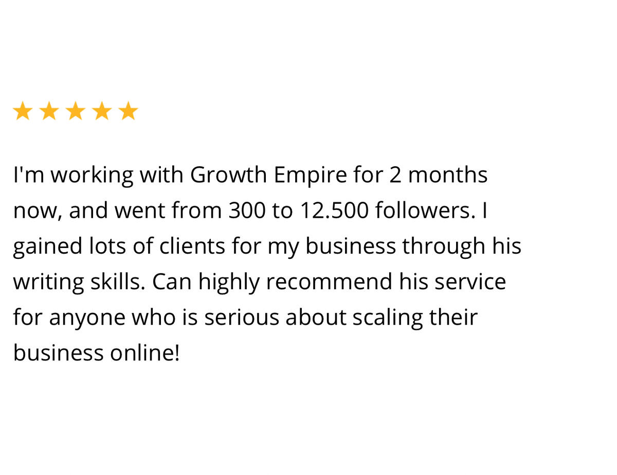 If you are an online entrepreneur, looking to grow your twitter account, make high-value connections, and increase profits then Growth Empire ghostwriting service is what you need.Creating a Twitter account is easy but creating good content with maximum engagement is time consuming and difficult. Our service will do all of the hard work while you sit back and enjoy the results.